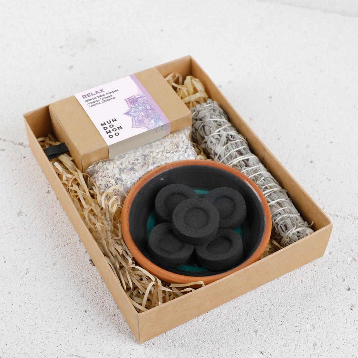 - Box of Relax Herbal Incense Blend: A calming mix of Sage, Rosemary, Lavender, and Eucalyptus to promote relaxation and tranquility.